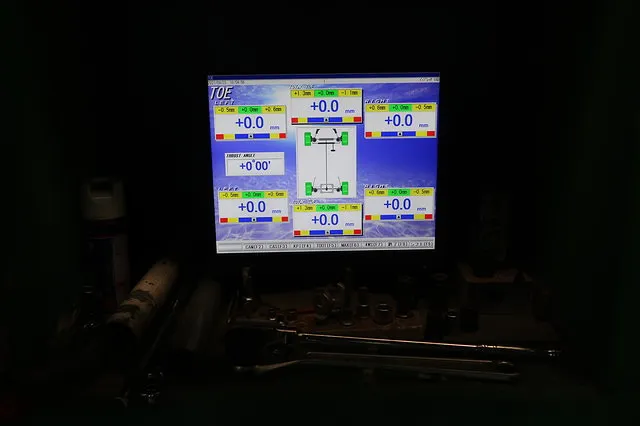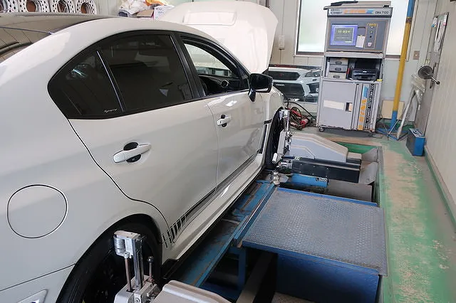 調整が必要な車はリアルタイムで数値が映し出されるモニターを見ながら、項目ごとに4輪を調整していきます。